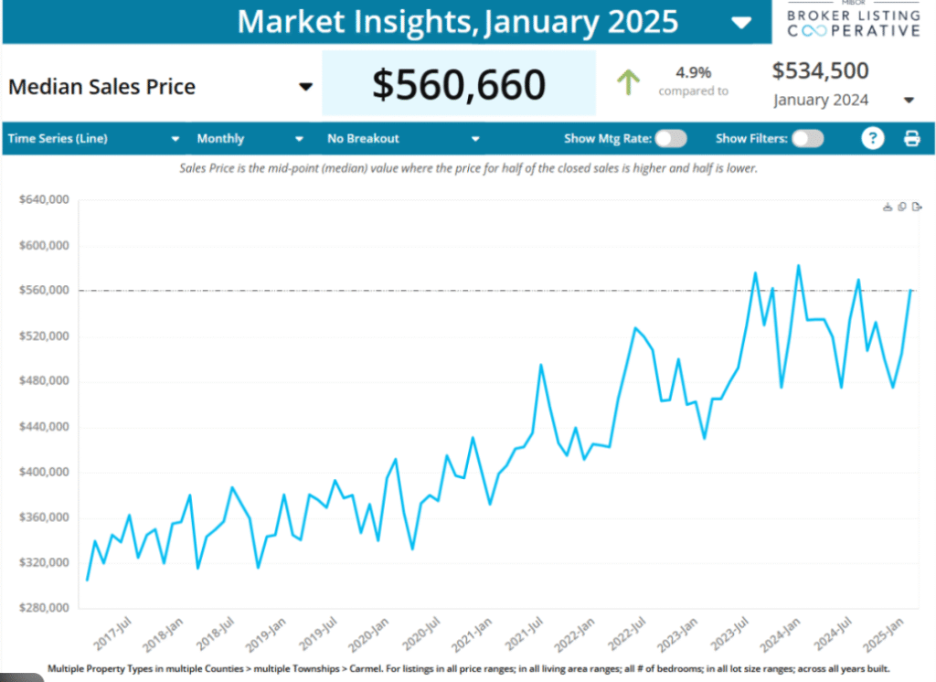 Carmel’s housing market continues to strengthen year over year. According to the Broker Listing Cooperative® Market Insights Report, the median home sale price in Carmel reached $560,660 in January 2025, marking a 4.9% increase compared to the same month in 2024.
